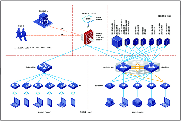 遵循安全、可靠、穩(wěn)定、高效的原則,把網(wǎng)絡(luò)劃分成5個區(qū)域。分別是遠程接入?yún)^(qū)域(L2TP over IPSEC VPN)、互聯(lián)網(wǎng)區(qū)域(untrust)、服務(wù)器區(qū)域(DMZ)、辦公區(qū)域(trust),其中辦公區(qū)域分為有線辦公區(qū)域(Lan)和無線辦公區(qū)域(Wireless)。