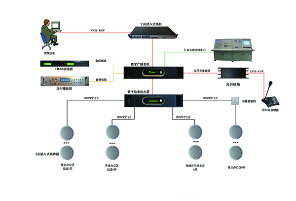 近年來,辦公大樓、購物中心和其他大規(guī)模建筑工程對于公共廣播系統(tǒng)能夠具備呼叫分配、播音、背景音樂及對建筑物內(nèi)的特定區(qū)域進(jìn)行常規(guī)信息播放的功能之要求日益增加。科海辦公樓廣播系統(tǒng)的設(shè)計(jì),順應(yīng)潮流和科技發(fā)展趨勢,從投資合理、外觀美觀、設(shè)計(jì)規(guī)范的設(shè)計(jì)原則出發(fā),要求廣播系統(tǒng)具備如下功能:①兼顧背景音樂、公共廣播、消防廣播的功能;②全數(shù)字結(jié)構(gòu);③結(jié)合防火分區(qū)劃分廣播分區(qū);④各廣播分區(qū)獨(dú)立音源、獨(dú)立廣播;⑤緊急廣播具備優(yōu)先控制權(quán)。