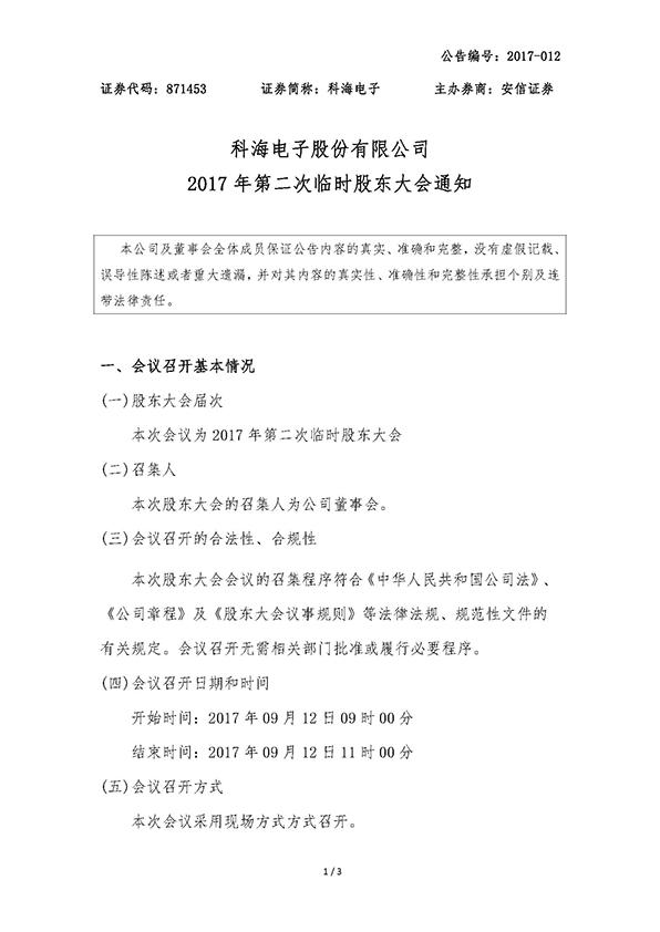 海電子股份有限公司2017年第二次臨時股東大會通知