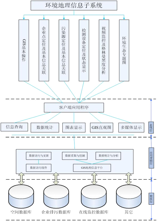 環境GIS充分利用現代計算機技術優勢,發揮強大的計算統計功能、可視化功能和多媒體展示功能,來管理和利用環境保護信息。其系統結構框圖如下: