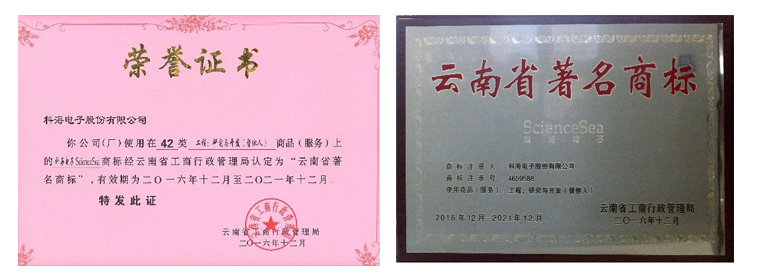 隨著市場經濟的日益深入,科海電子股份有限公司實施商標戰略,憑借優質的產品質量,強大的云南市場占有率、市場覆蓋率,優良的企業文化及形象,健全的售后服務體系,積極爭創著名商標,于2016年12月榮獲云南省工商行政管理局頒發的“云南省著名商標”稱號。